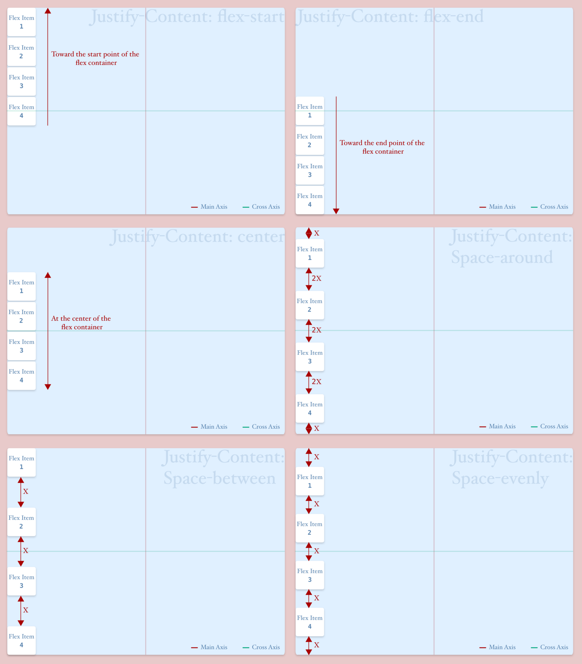 justify-content: "flex-start" || "flex-end" || "center" || "space-around" || "space-between" || "space-evenly"